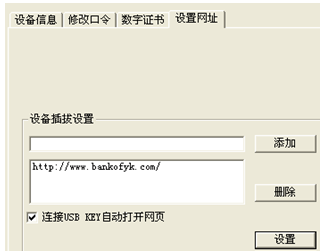 ?、谠蚴菦](méi)有勾選自動(dòng)打開(kāi)網(wǎng)頁(yè)。雙擊小黃鎖或者是我行EK圖標(biāo)——設(shè)置網(wǎng)址,進(jìn)入下圖畫(huà)面,將我行網(wǎng)址m.fyw99.com添加入列表,勾選“連接USB KEY自動(dòng)打開(kāi)網(wǎng)頁(yè)” ,且點(diǎn)擊設(shè)置。