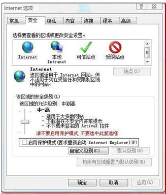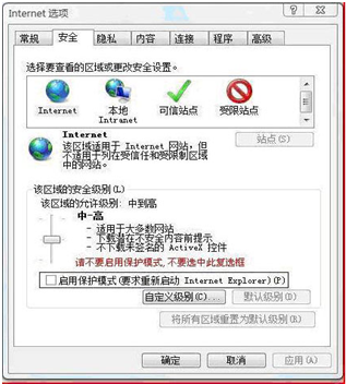 ④如果是win7或者是vista系統(tǒng),請(qǐng)關(guān)閉IE的保護(hù)模式,如下圖: